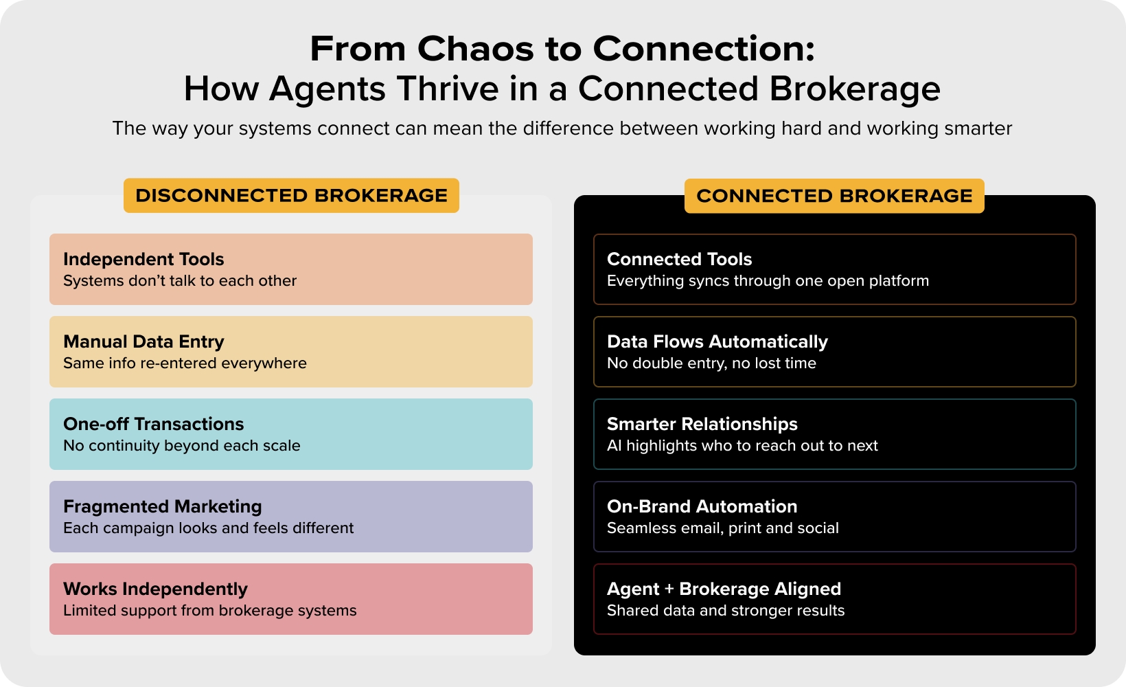With everything working together, brokerages can shift their focus from transactions to long-term relationships that help agents drive referrals and repeat business, and even generate continuous revenue for the brokerage in the form of core services. It allows agents and brokerages to combine personal connections with organization-wide insights, creating a more consistent and valuable client experience.