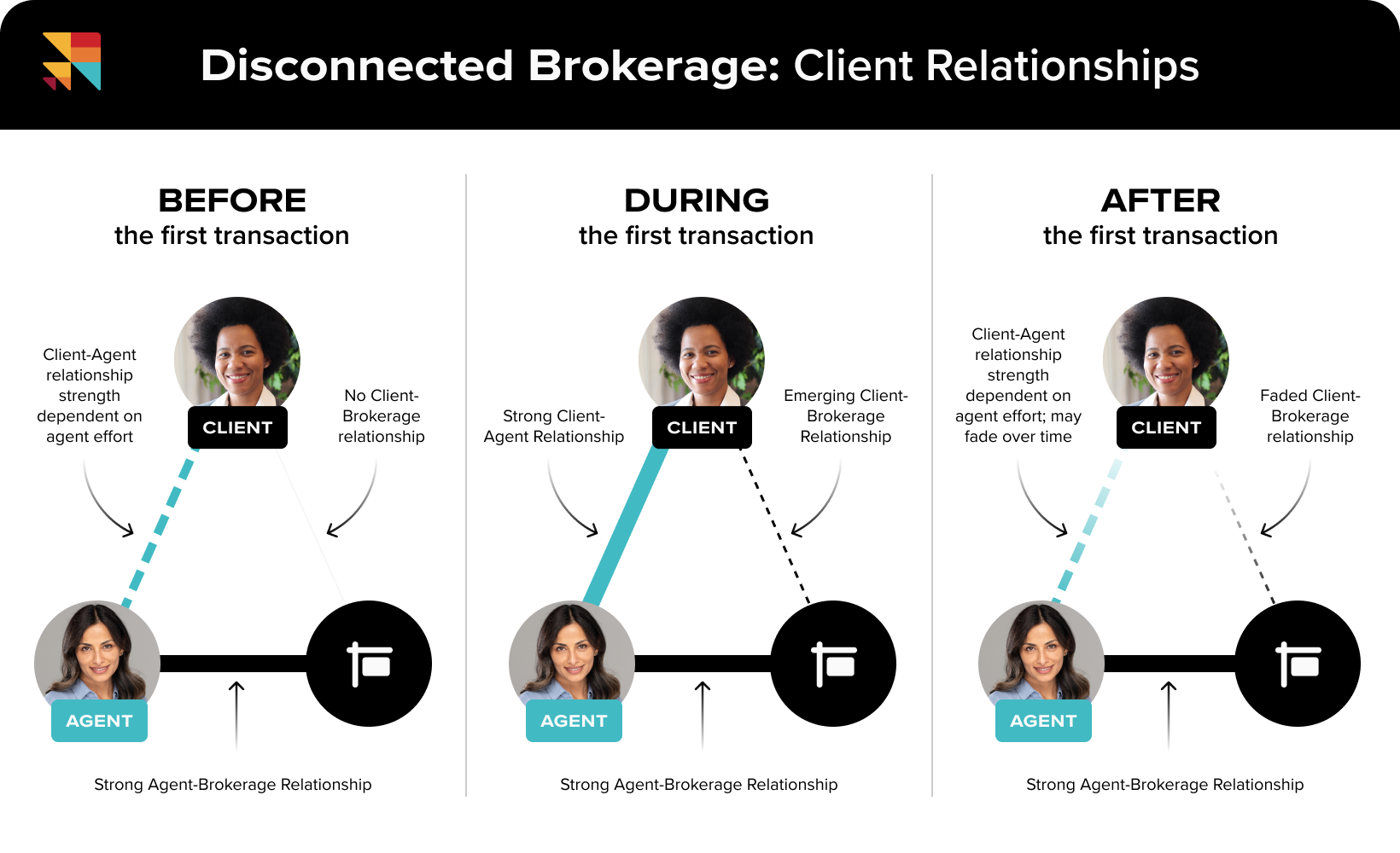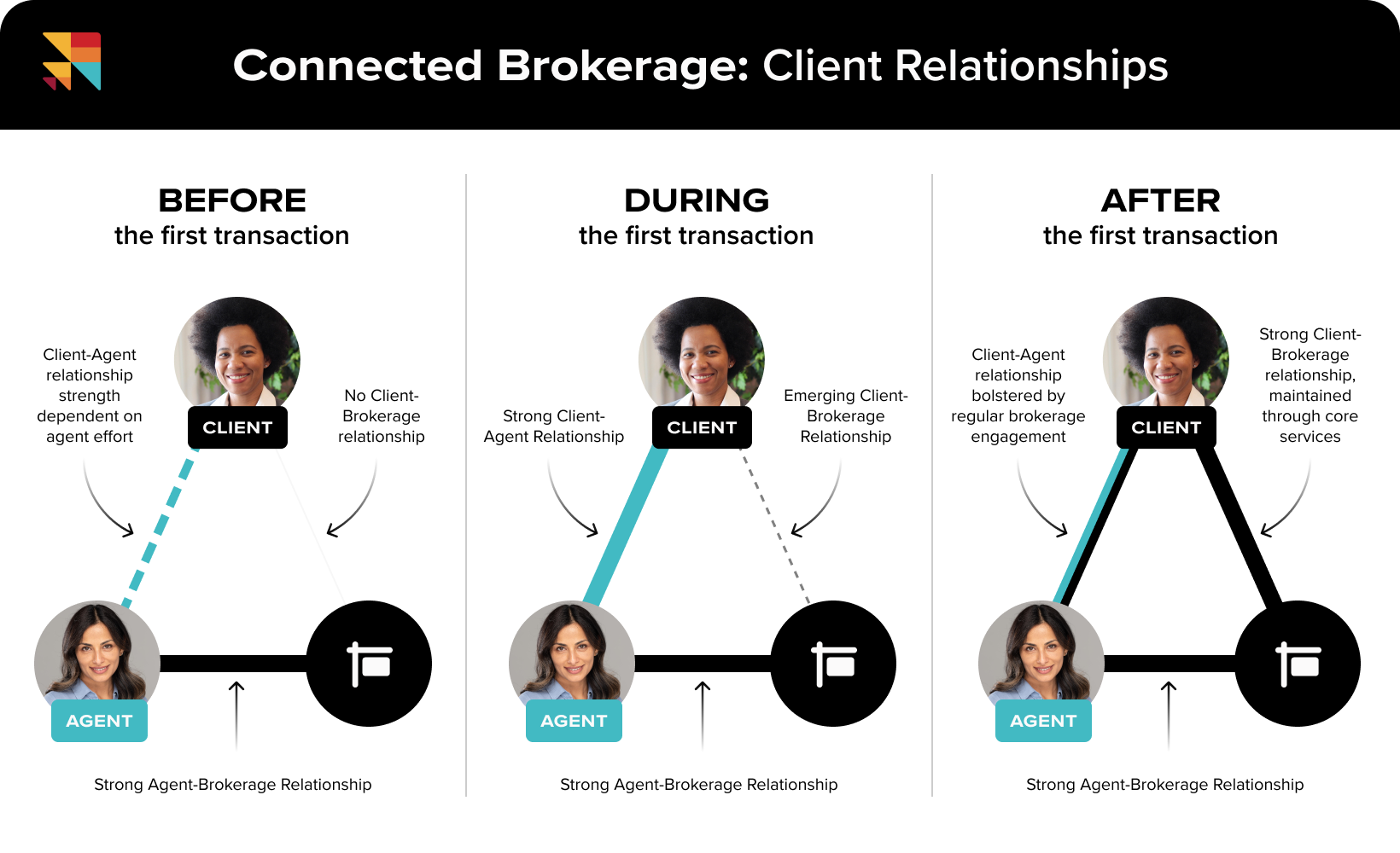 In contrast, in a connected brokerage, both agent and brokerage maintain strong relationships with the client. These connections support each other, creating a more consistent and valuable client experience.