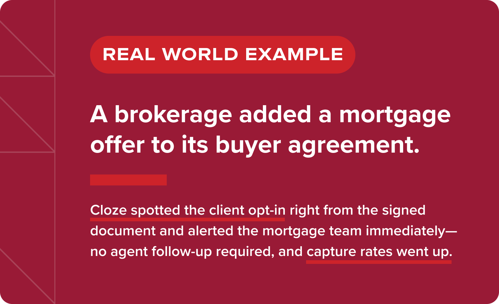 Real World Example: A brokerage added a mortgage offer to its buyer agreement. Cloze spotted the client opt-in right from the signed document and alerted the mortgage team immediately—no agent follow-up required, and capture rates went up.